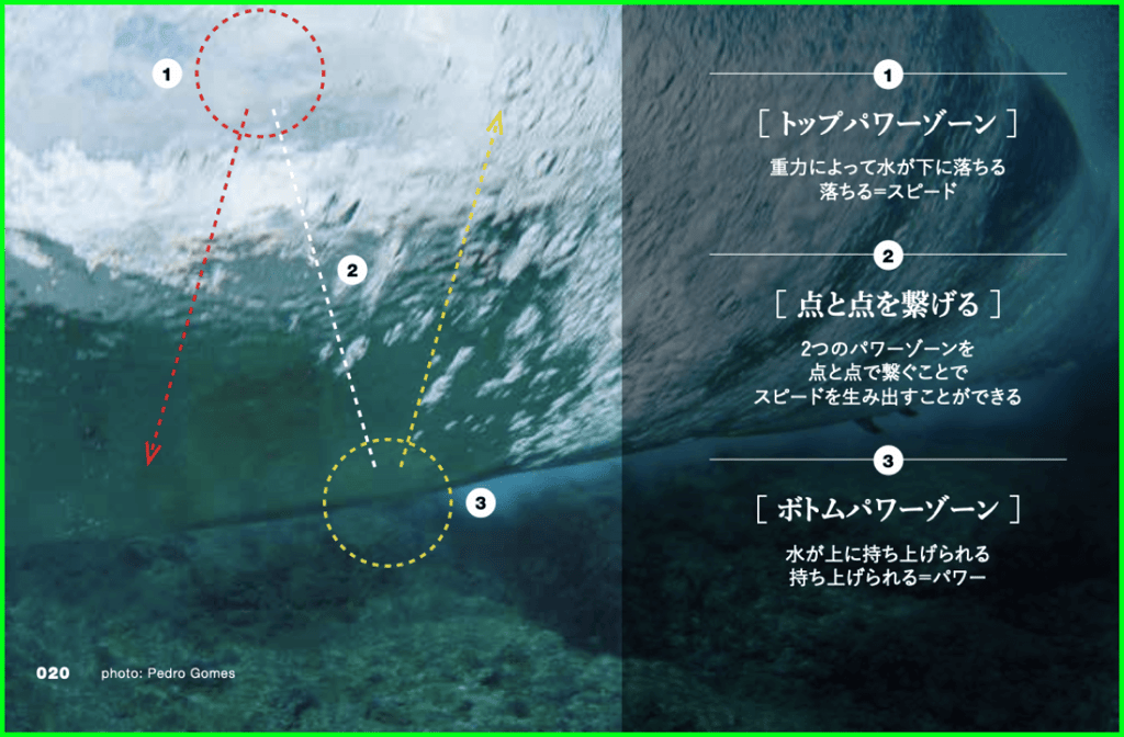 波にはトップ(波の上部分)とボトム(波の下部分)があり、それぞれ異なる特徴を持っています。トップは重力による下向きの力が強く働き、一方でボトムは水の押し上げる力が強くなります。テイクオフでは、ボトムのパワーゾーンを利用することが重要です。